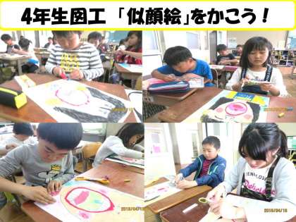 図工では,「自分の似顔絵」に挑戦中の子どもたち。