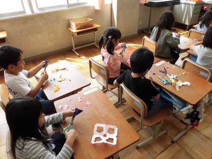 図工の時間に,折り紙とはさみを使ってかざりを作りました。