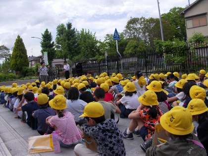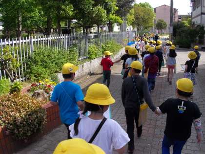 社会科「学校のまわりのようす」で校区探検にでかけました。第一回目の今日は校区の北側に行きました。久我の杜図書館まで行ったところで,そこから見える建物,地図記号などについて学習しました。