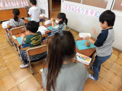 ねんどをこねたり,のばしたり,小さくちぎっておだんごを作ったり,コロコロのばして長いひもを作ったり…