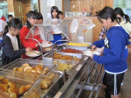 子どもたちは,バイキング形式でそれぞれの盛り付けを行っています。