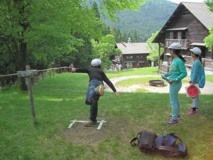 山の家敷地内の様々な場所に設置されているゴールを目指し,フリスビーを飛ばします。