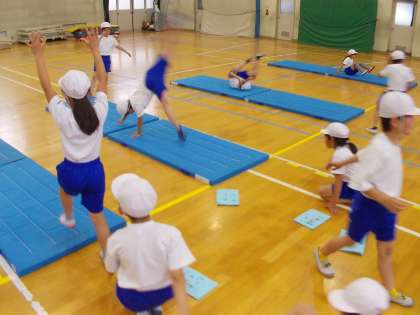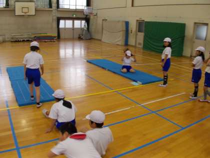 マット運動の学習が始まりました。グループで協力して学習を進めています。今日は準備運動のやり方,学習の流れをつかみました。さっそくできる技をたくさん練習していました。