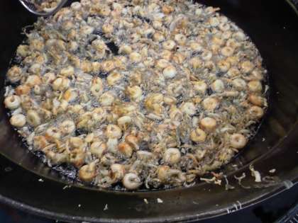 本日はもずくのかきあげ。新献立です。今までもずくは汁物の中に入れて食べていました。今回は汁物に入れず,揚げました。沖縄にはもずくの天ぷらがありますが,給食ではもずくのかきあげにしました。夏になると外気温が高くなり,さらに油を使っている釜の周りはとても温度が高くなるので,揚げるのはとても大変でした。いつもとは一味違ったもずくの食べ方を楽しんでもらいたいです。