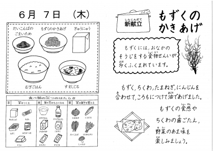 本日はもずくのかきあげ。もずくは海藻で,食物繊維が豊富な食べ物です。ぬめりがあるのが特徴です。給食ではもずくをかきあげにしました。ぬめりが苦手な子も揚げることでもずくがカリッとなり食べやすくなったのではないかと思います。子どもたちの反応は様々で,