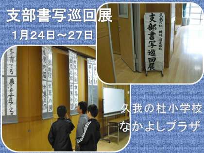 1月24日〜27日まで、久我の杜小学校「なかよしプラザ」で支部書写巡回展を開催しています。神川小学校・羽束師小学校・久我の杜小学校の子どもたちの書写作品を展示しています。