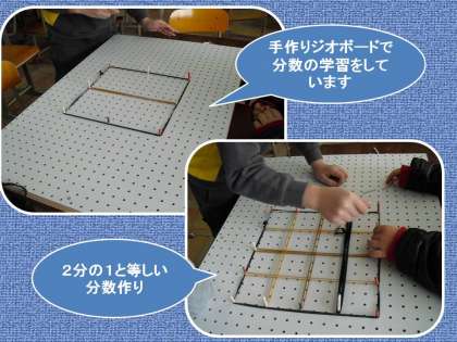 手作りのジオボードに、まず基本となる1を作ります。それから、2分の1を囲みます。