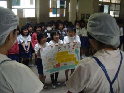 一年生のあるクラスは、給食調理員さんに寄せ書きをおくり、感謝の気持ちを伝えました。さらに、普段は見ることのできない調理場の見学もしました。子ども達は大きな鍋やしゃもじにとても驚いた様子で、何度も歓声が上がりました。