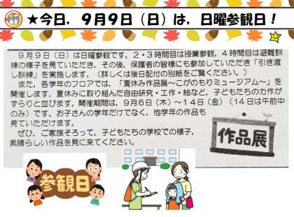 ★今日,9月9日(日)は,日曜参観日!(2018/09/09)