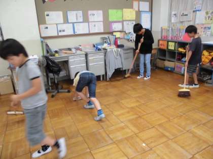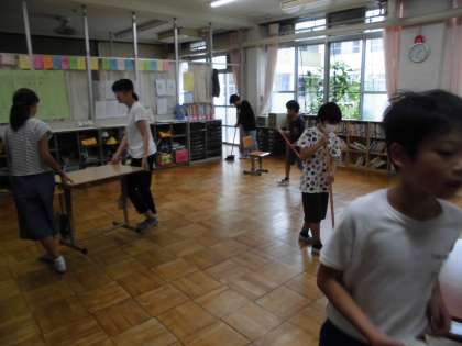 二学期になり毎週水曜日は5年生が交流掃除に来てくれることになりました。一緒に机を運んだり,ゴミを捨てに行ったりと協力して掃除をしました。5年生これからよろしくお願いします。
