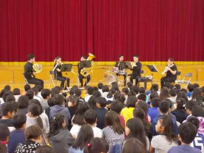 今日は文化芸術鑑賞がありました。体育館で「オルカブラス」のみなさんに金管楽器を中止としたたくさんの曲を演奏していただきました。みんな初めて間近で聴く楽器の演奏に「床まで響いてびっくりした」「大きくてとてもきれいな音だった」と感想を聞くことができました。