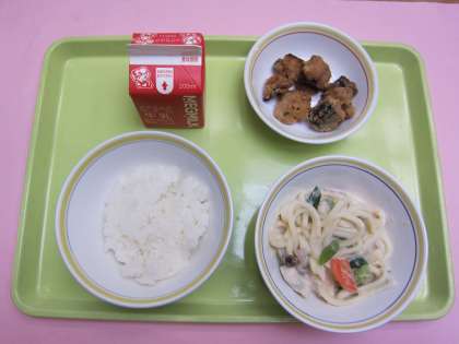 今日はうどんの入った豆乳鍋なので,ごはんを減量しています。