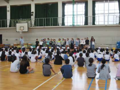中間休みの体育館では色別集会が行われていました。
