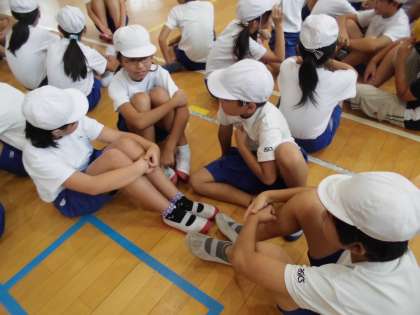 団体競技の棒引きでは,それぞれチームに分かれて作戦をたてました!