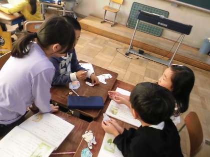 かわいらしいかえるくんやがまがえるくんが机の上に置かれ,それを動かしながら練習する姿が見られました。