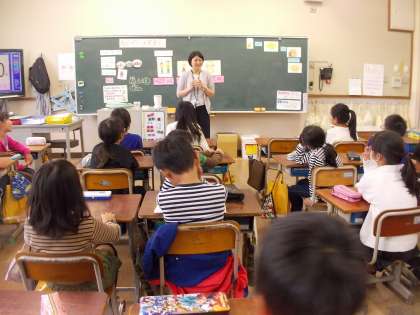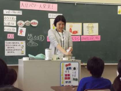 今日は栄養教諭の中島先生より「大豆パワー大発見」として,様々に姿を変える大豆とその力を楽しく,わかりやすく教えていただきました。目の前で大豆をミキサーにかけて,きなこ作りを見ることもできました。国語の学習とあわせてとても学習が深まりました。