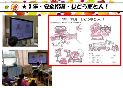 大型画面に安全ノートの画像を映し出しながらの指導です。