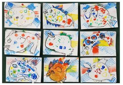 ローラーをかけた画用紙にスタンピングした魚をはりつけました!