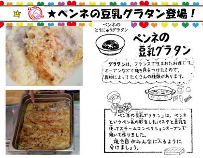 給食に,ペンネの豆乳グラタンが登場!