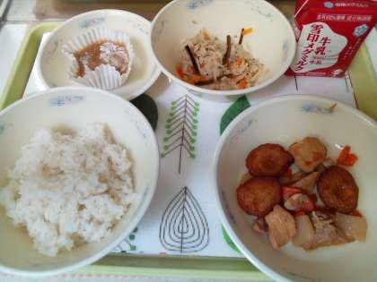 今日の給食は「むぎごはん・牛乳・平天とこんにゃくの煮つけ・切干大根の三杯酢・ういろう」でした。