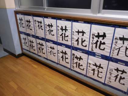 4年生になって,毛筆の学習がはじまっています。第1回は「花」を書いています。手本を見ながら丁寧に書くことを心がけています。