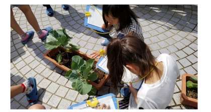 中庭で育てているキャベツにモンシロチョウの卵がついているかどうかを観察しているのでした!