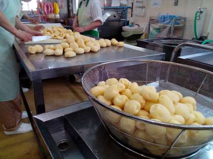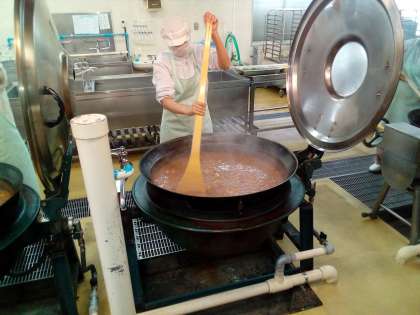 ビーフシチューのルーは給食室で1時間かけて丁寧に作っています。じゃがいもは全校分で37.5kgありました。