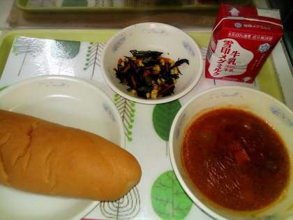 今日の給食は,「ミルクコッペパン・牛乳・ビーフシチュー・ひじきのソテー」でした。