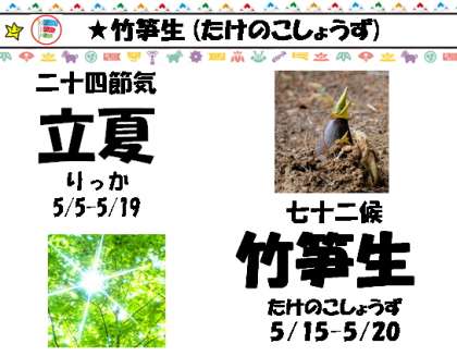 たけのこが出てくる頃。竹冠に旬と書いて「筍(たけのこ)」旬は一旬,上旬,中旬,下旬などというように,10日ほどの期間を表す言葉。たけのこは成長が早く,10日ぐらいで竹になってしまうのでこの字が当てられたそうです。