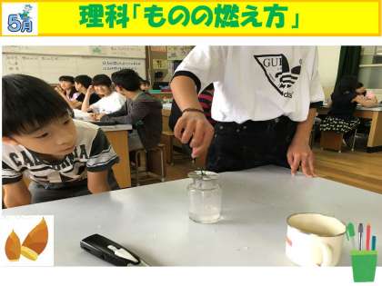 理科「ものの燃え方」の実験。物体が燃えるときは,空気中の酸素が使われて,二酸化炭素ができることについて学びました。「ものの燃え方」の授業も,いよいよまとめに入っていきます!!