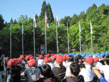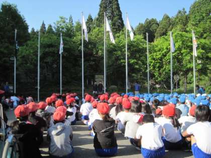 一緒に宿泊学習をしている,5校のお友達の前で,しっかり久我の杜小学校の