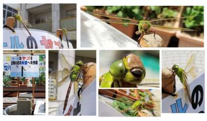 プールのヤゴを久我の杜の大空へ大作戦看板にとまらせました。