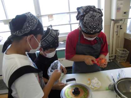家庭科の学習で,「ゆで野菜サラダ」を作りました。
