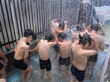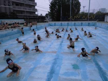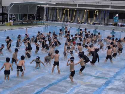 水をかけ合ったり,カニ歩きやワニ歩きをしたりして,水に慣れていきました。
