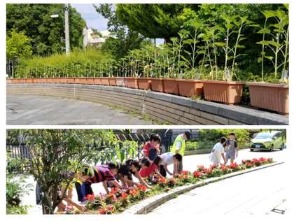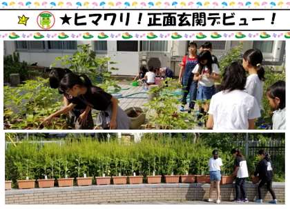 本日!栽培委員会のプランター・ヒマワリが,正面玄関デビューしました!