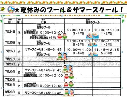 7月24日(水) 9;:00-10:00 3・4年 10:30-11:30 1・2年