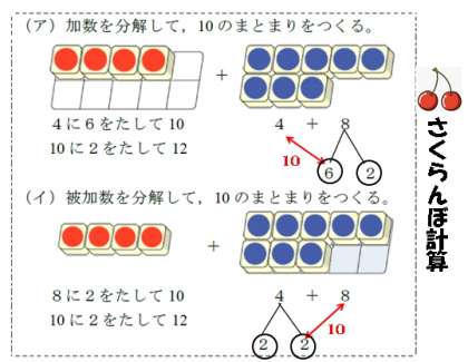 さくらんぼ計算というのは,繰り上がりのある足し算を10のまとまりを作って「10といくつ」で答えを求めていく計算方法です。