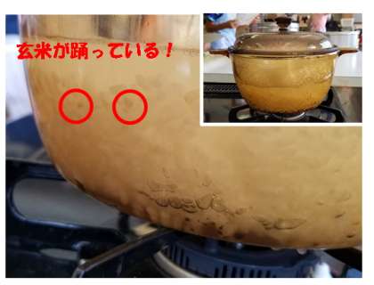 透明なガラス鍋の中で,玄米が踊っていました!