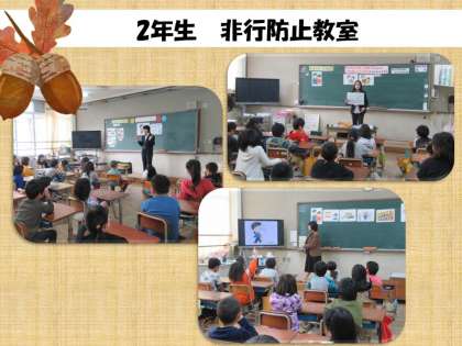 向日町警察署よりスクールサポーターの方に来ていただき,2年生が非行防止教室で学びました。