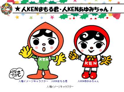 2人とも,前髪が「人」の文字,胸に「KEN」のロゴで,「人権」を表しています。人権が尊重される社会の実現に向けて,全国各地の人権啓発活動で活躍しています。