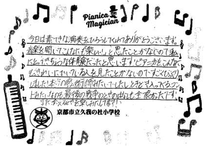 ◆今日はステキな演奏をひろうしてくれてありがとうございます。音楽を聞いてこんなに楽しい!と思ったことがないので,私にとって貴重な体験だったと思います。ピアニカをこんなにもきれいにひいている人を見たことがないので,すごくびっくりしました!本当の魔術師みたいでしたし,ときどき入ってくるコントみたいなのも,最後の戦争のときのはなしも全てよかったです。また会えるときを楽しみにしています。