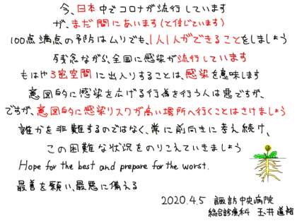 諏訪中央病院の玉井先生へ確認させていただき,「新型コロナウイルス感染をのりこえるための説明書」の取扱いを次のとおりとします。
