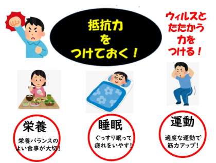 (2)抵抗力をつけて,新型コロナウィルスが体内に入ったときに,たたかえる力をたくわえておく!