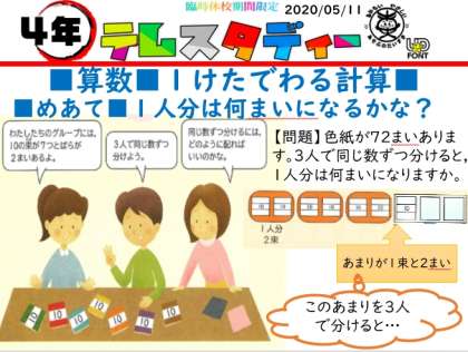 【問題】色紙が72まいあります。3人で同じ数ずつ分けると,1人分は何まいになりますか。