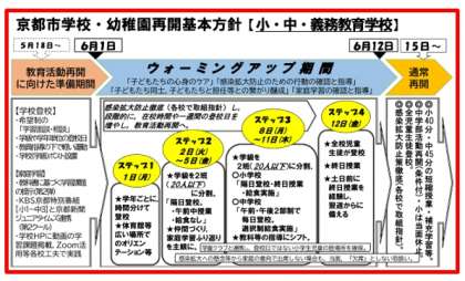 政府による緊急事態宣言及び京都府知事からの学校に対する休止要請が解除されたことを受け,下記のとおり,本市立学校・幼稚園を再開します。