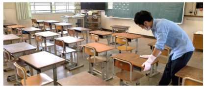 子どもたち,ひとりひとりの机,いすを消毒しながら,