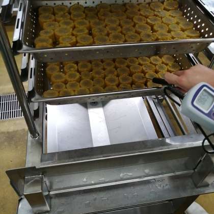 給食では衛生面に配慮し,食材の中心の温度を測り,温度が75度以上であることを確認してから1分間以上加熱しています。(二枚貝やエビは85度から90度 90秒間以上加熱しています。)