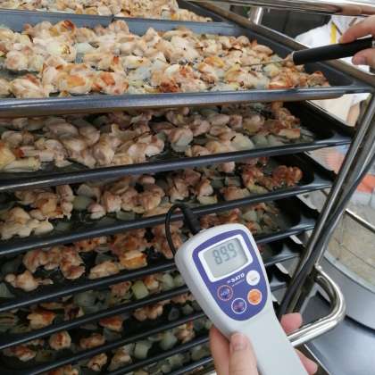 給食では衛生面に配慮し,食材の中心の温度を測り,温度が75度以上であることを確認してから1分間以上加熱しています。(二枚貝やエビは85度から90度 90秒間以上加熱しています。)