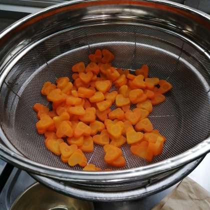 給食週間1日目,2月1日(月)の給食では,鶏肉と野菜の煮つけにハッピーキャロットがありました。各クラスハートの形のにんじんが入っていました。給食調理員さんが一つ一つ丁寧に100個以上型抜きしました。