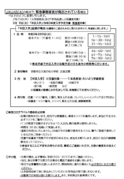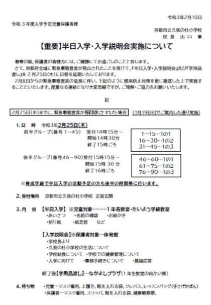 令和3年度入学予定児童保護者様におかれましては,2月25日(木)にご予定いただいております標記保護者説明会,体験入学について,現在発出されています緊急事態宣言の継続,解除に伴い,体験入学の日程変更の可能性があります。過日配布させていただきました案内を再度ご確認いただきますようお願い致します。